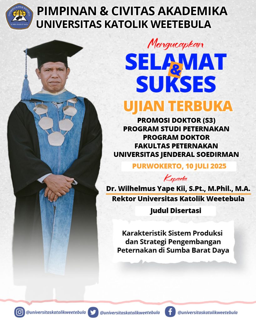 Karuni, 10 Juli 2025 – Universitas Katolik Weetebula dengan bangga mengumumkan pencapaian akademik membanggakan dari Rektor, Dr. Wilhelmus Yape Kii, S.Pt., M.Phil., M.A., yang berhasil menyelesaikan Ujian Promosi Doktor pada Program Studi Peternakan, Program Doktor, Universitas Jenderal Soedirman.